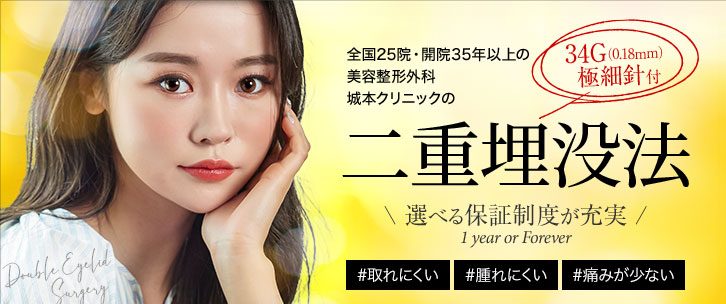 ![]() 城本クリニック 横浜院 | 埋没法:両目:55,000円~ 切開法:両目:300,000円~ | 無料 | 「1年保証」と「永久保証」の2種類の選択肢あり ※保証期間要確認 |